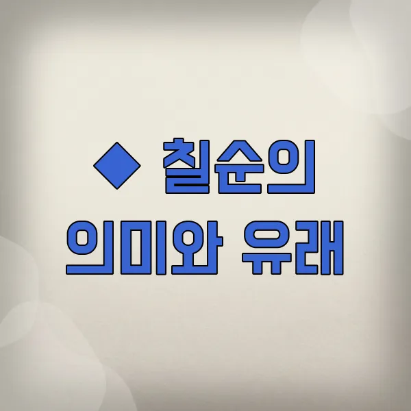 칠순은 한자 그대로 풀이하면 '일흔 살'을 뜻해요. 예로부터 "인생칠십고래희(人生七十古來稀)"라는 말이 있듯, 일흔 살까지 사는 것이 드물었기에 큰 경사로 여겼답니다. 비록 지금은 평균 수명이 늘어났지만, 여전히 부모님이나 어르신의 건강과 장수를 기원하는 귀한 날로 소중히 기념하고 있습니다.